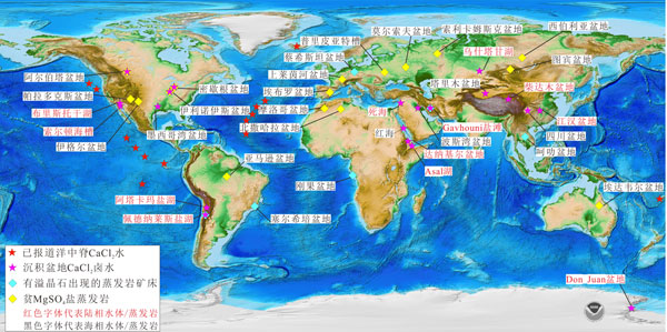 世界典型CaCl2卤水和贫MgSO4盐蒸发岩分布图