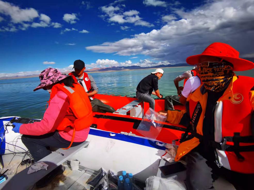 科考队员在依布茶卡盐湖进行水体和沉积物样品采集