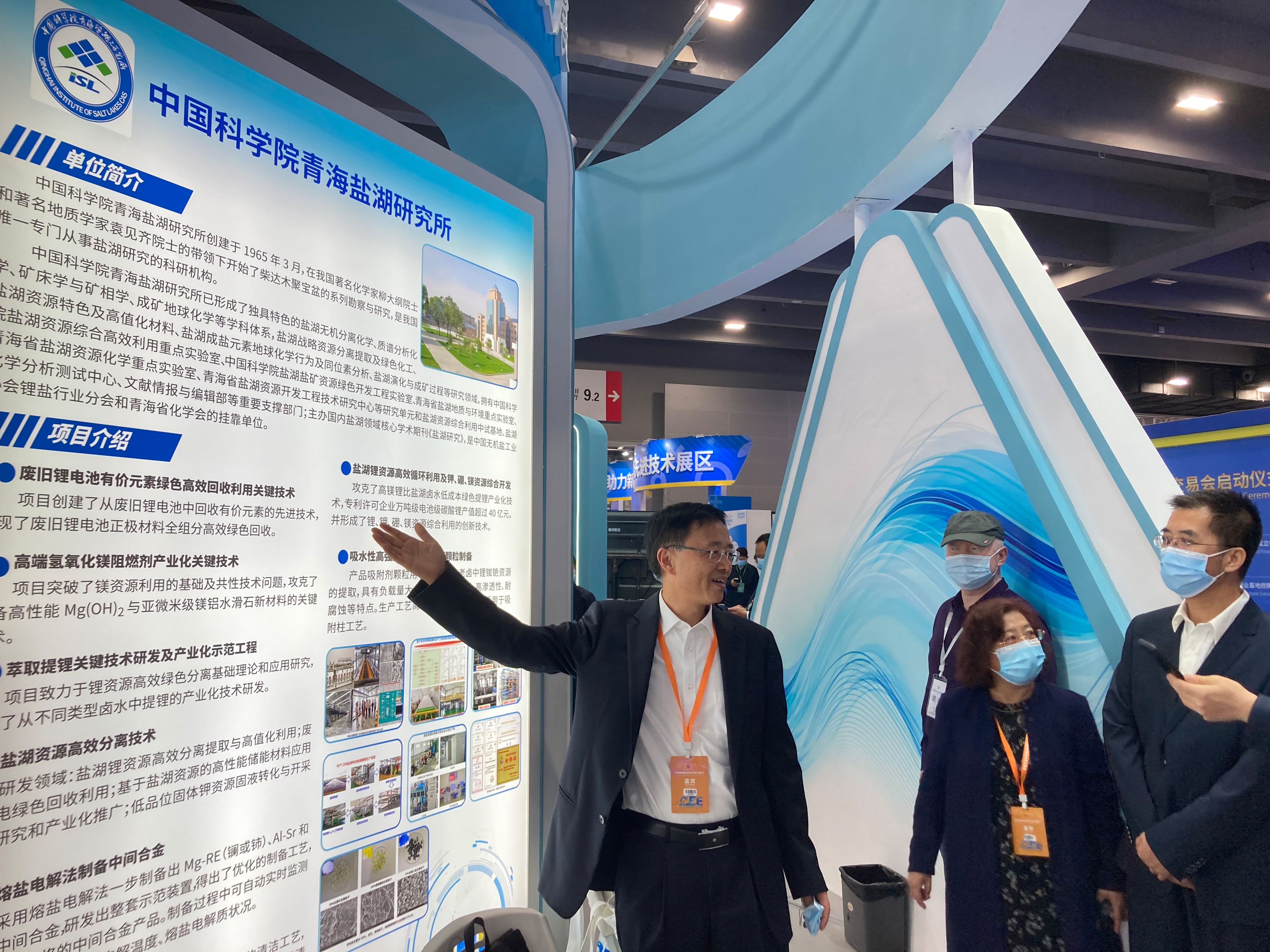 青海盐湖所废旧锂电池有价元素绿色高效回收利用关键技术、高端氢氧化镁阻燃剂产业化关键技术、萃取法提锂关键技术研发及产业化示范工程、盐湖资源高效分离技术、熔盐电解法制备中间合金、铬化工绿色清洁技术研发、盐湖锂资源高效循环利用及钾、硼、镁资源综合开发、吸水性高强度锂铷铯吸附剂颗粒制备技术等相关成果进行了参展。丛斌一行莅临青海盐湖所展区,对青海盐湖所科技创新工作给与了充分的肯定和赞扬。