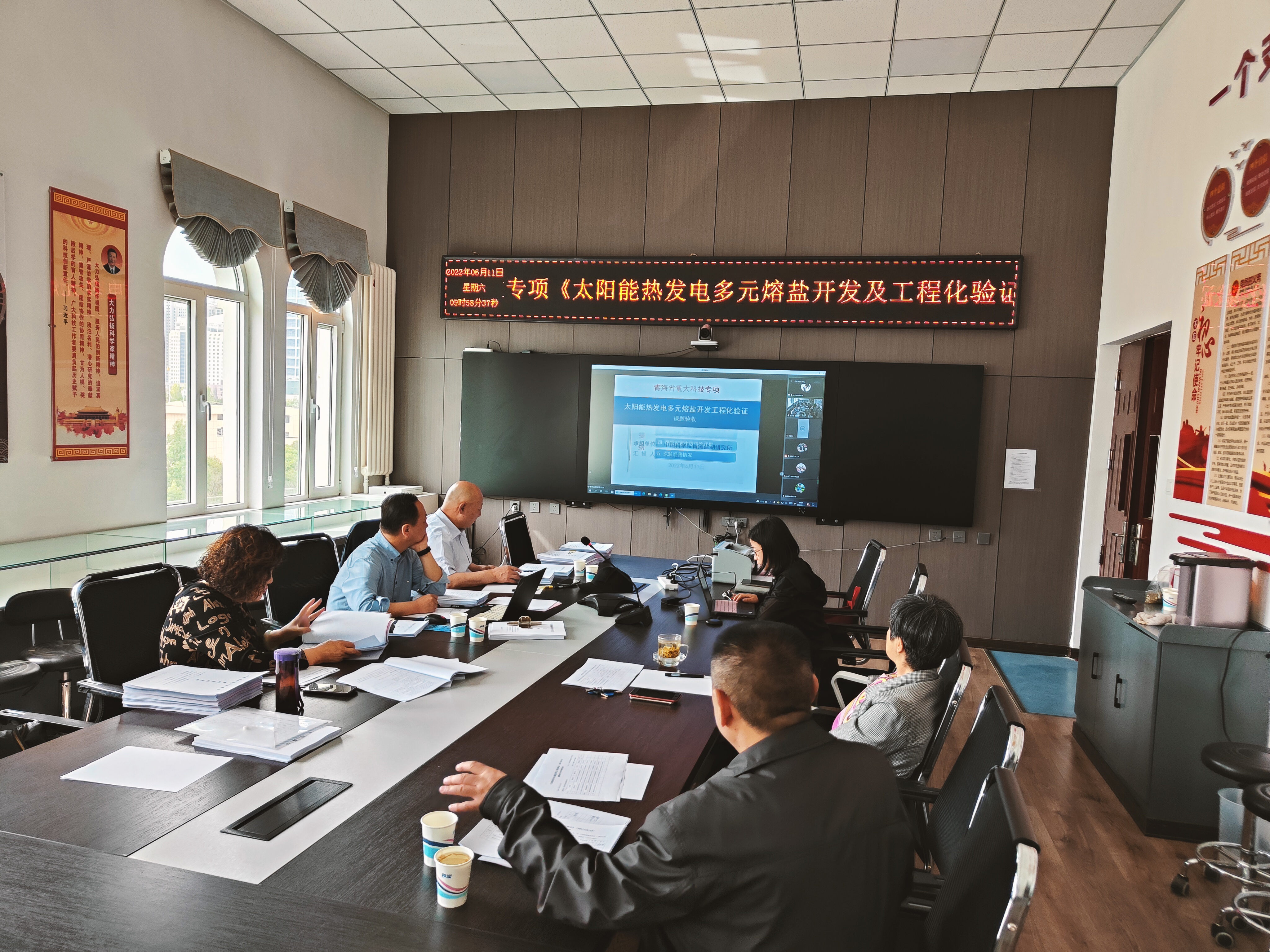 6月11日,青海省重大科技专项 “太阳能热发电多元熔盐开发及工程化验证” 项目四个课题验收会议采用线上线下相结合的方式召开,中国科学院青海盐湖所(以下简称青海盐湖所)为线下主会场。项目牵头单位青海盐湖所,参与单位青海中控太阳能发电有限公司、青海联大化工科技有限公司、北京工业大学、青海爱能森新材料科技有限公司、中国科学院上海应用物理研究所等相关课题负责人和参与者共20余人参加了此次会议,并邀请相关领域专家对各课题进行了评审。