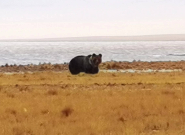 有了第一天的成功,第二天我们便信心满满地前往核心区里面的玛尔果茶卡。到这个湖并没有路,我们沿着去年工作时依稀留下的车辙印前行。翻过三个山头,便能远远看到湖面了。去年湖边陷车的场景还历历在目,四辆车每辆车都陷了至少两次,想到这里,我心中不觉紧张起来。好在车子顺利到达湖边而没有陷车。站在湖边,看着广阔的湖面,大家心中默默祈祷,希望这个湖水不要太深,浪不要太大。万幸,这个湖虽然面积大,但水比较浅,风浪也不大,两天时间便顺利完成了工作。第二天傍晚返程时,我们在热觉茶卡湖边上见到了两只熊,一大一小,远远看去,还以为大的是一头野牦牛,走近了,大熊竟然站了起来,车开近了,才慢慢走开。大家都开玩笑说,幸好没在湖边扎帐篷,不然这么大的熊,几个人都不够它吃的。随后,在完成了康如茶卡的考察之后,我们便赶往荣玛乡附近的依布茶卡。依布茶卡虽然面积大,但去年已经下了船,知道水并不深,加上前几个盐湖考察比较顺利,心情便稍有些放松。但这次考察却大不一样了,依布茶卡一改去年的风平浪静,整个过程中风浪就没停过。三天的考察,我们碰到了橡皮船被风吹到对岸而无法返程的情况,也感受到了太阳落山后湖面彻骨的寒冷,当然还有冰雹砸在脸上眼睛都不敢睁开的疼痛,……。唉,真是翻脸比翻书还快啊,老朋友的面子都不给。