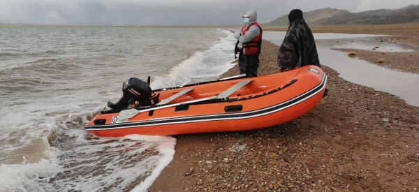 果然,第二天一大早起来,天上阴云密布,不一会儿还飘起了雪花。但为了不耽误科考进度,我们还是收拾东西驱车前往热觉茶卡。行车途中,车窗外面隐约看到迎着风雪跃动的藏羚羊,心里油然升起对生命的敬畏之心。好在中午到达湖边时,乌云散去,湖面也难得风平浪静。机不可失,我们快速把船收拾好,便开始下湖。然而到了下午,大风又刮起来,队员们在风浪中小心翼翼的保持着船的平衡,采样工作愈加困难。幸好湖水不算太深,加上队员们已经有了一些经验,最终在傍晚时分顺利完成了当天的工作。尽管有些小磨难,但总算开了一个好头,大家心里都舒了一口气!
