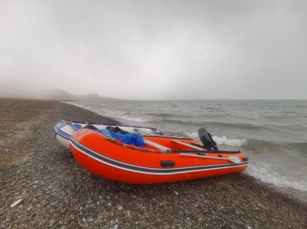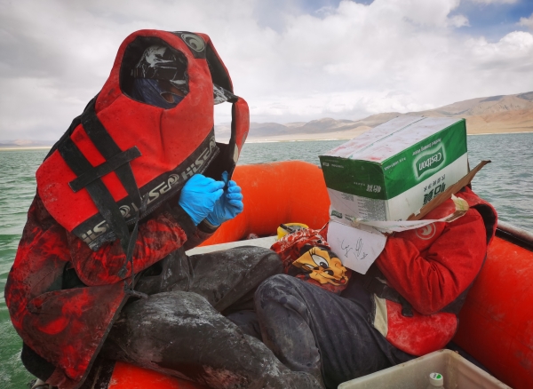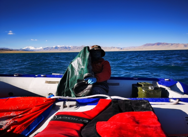 后面,我们又经历了湖中太阳暴晒下人员中暑、冰雹大浪、感冒高反,但这么多天下来,大家已经习以为常,或者说麻木了......。然而,在海拔超过5000米、水深近70米的龙木错,真正的危机才悄悄袭来。在龙木错考察即将结束时,发动机突然失灵,无奈湖上风浪特别大,只能小心翼翼地控制着船顺风漂到远离出发点的湖岸,而此时已经晚上8点多了。大家下了船,沿着泥泞不堪的湖边步行前往远处的一个修路站。大家穿着雨裤,深一脚浅一脚,翻过一个又一个小河沟,却总也走不到看似不远的修路站。到了夜里11点多,天色完全黑了下来,几个人不由得心里害怕,这可是无人区啊,谁知道会碰到啥东西突然跟上来或窜出来!虽然还有一些食物,但并没有带水(主要考虑船上穿着雨裤上厕所不方便)。夜里的野生动物肯定会多起来,大家不由自主想起白天见到的狼,头皮都感觉有点发麻了。为了抵抗乏意和减轻惧意,几个人只能不停地聊天、喊话,或者打开手机闪光灯,生怕和狼、熊不小心碰个照面。可只有不停歇才能有获救的希望,大家迈着沉重的步伐继续前进。海拔太高了,人呼吸都很困难,走路也要走不动了,马上就到生理极限了,如果碰到野生动物,逃跑也不可能了,心里想着,今天就要在这个地方回归大自然了。疲劳的身体加上沉重的心理负担,一个年轻的队员此时已经不再说话,只是机械地一步一步往前挪。生死边缘,似乎一切都无所谓了。最终,在拖着疲乏的身躯步行20多公里后,凌晨两点半,我们终于到了这个修路站。可悲催的是,手机没有信号,依然联系不上车上的人。让人感动的是,修路站人员不仅给了我们一些水和面包果腹,还开车把我们送到有信号的地方,让我们又一次感受到了西藏的热情。和车上的人取得联系之后,队友们立刻就来接我们,此时已经凌晨3点半了。一行人在最近的村子里也没有找到住宿的地方,而多玛乡还在100多公里之外。为了不过多耽误工作,我们决定在车里睡一宿,明天还要去找船修船。