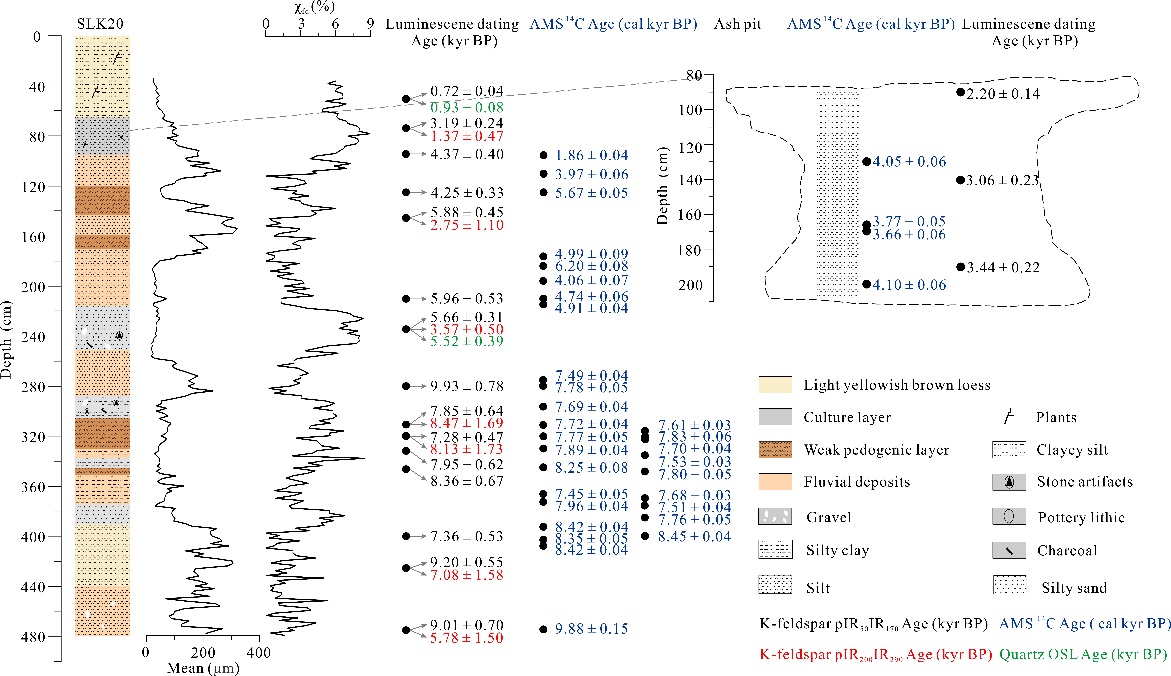 (a)和(b)分别为SLK20剖面样品χfd(%)和平均粒径(μm)分布;(c)为青藏高原东北部黄土-古土壤剖面RYS17χfd的分布(Li et al.,2020b);