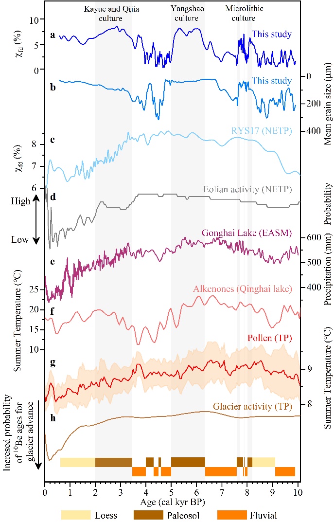 (h)为青藏高原上冰碛垄年龄的概率密度(Chen et al., 2020);灰色垂直条带表示文化层发育时期。