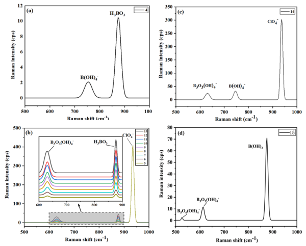 图1.不同硼浓度水溶液中硼-氧化合物的Raman光谱。(a)模拟了海水,(b、c、d)分别模拟了不同硼浓度的卤水。