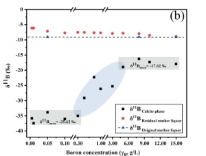 图2.不同硼浓度(形态)母液中方解石沉积实验所得产物的硼同位素特征