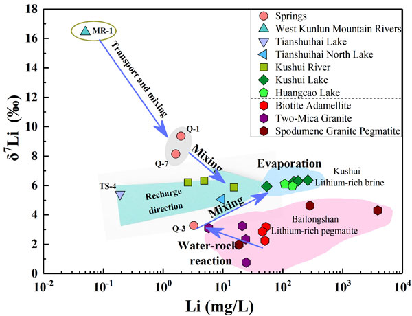 研究表明,流域河水化学组成主要受蒸发岩溶解和硅酸盐岩风化作用控制,与该地区广泛分布的长英质火成岩密切相关。水体中多种微量元素异常富集,尤其是泉水中典型热液富集元素(Co、Ni、Cs等)的丰度普遍数倍高于其它补给河流且与Li呈良好的正相关关系,表明研究区深部地热流体也为苦水湖提供了丰富的稀有元素物质来源。锂同位素分析结果表明,苦水湖富锂卤水高Li含量和低δ7Li值的特征主要是地壳深部热液水—岩相互作用及表生风化作用共同作用的结果。