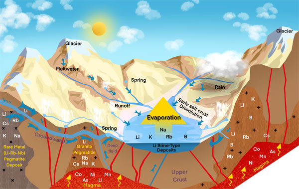 中国科学院青海盐湖研究所(以下简称“青海盐湖所”)盐湖地质与环境实验室研究团队针对上述区域典型盐湖进行了系统的野外地质调查和样品采集,通过元素地球化学和同位素地球化学分析研究,初步确定了该区域富锂水体中锂的物源属性、分布特征以及从“源”到“汇”的迁移富集规律,探讨了卤水型锂矿与花岗伟晶岩型锂矿的关联性,在此基础上建立了西昆仑山间盆地典型盐湖锂矿床的成矿概念模型,是近期青藏高原卤水型锂矿成因机制研究的新成果。