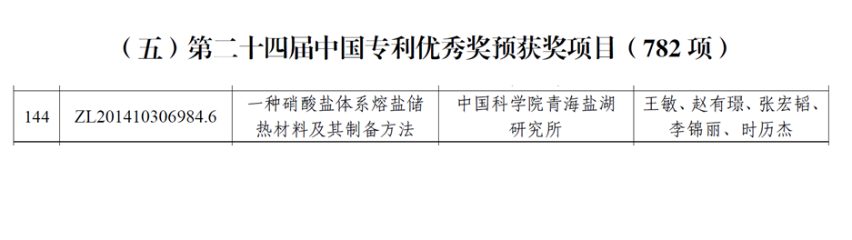 4月17日,由国家知识产权局和世界知识产权组织共同主办的第二十四届中国专利奖评审结果公示。青海盐湖所核心专利“一种硝酸盐体系熔盐储热材料及其制备方法”被授予中国专利奖优秀奖并通过公示。