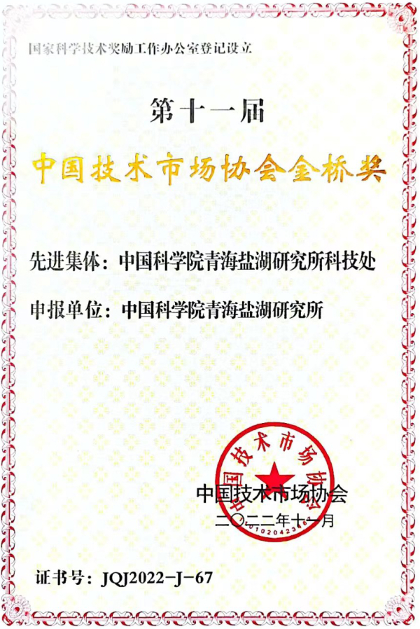 大会表彰了2021-2022年度在科技成果转移转化方面做出突出贡献的项目、集体、个人以及优秀项目、先进集体,先进个人。青海盐湖所“梯度耦合膜提锂关键技术与示范”项目荣获“突出贡献项目奖”,科技处荣获“先进集体奖”,并受到大会表彰。
