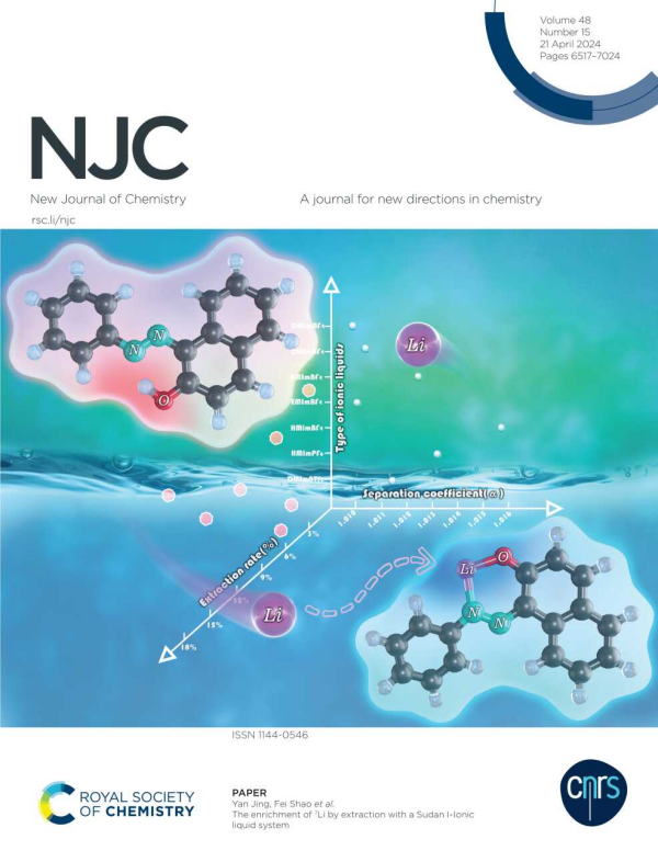 中国科学院青海盐湖研究所同位素分离与化学品精制课题组针对苏丹Ⅰ(1-苯基偶氮-2-萘酚)萃取富集7Li分离效应低问题开展研究。基于离子液体在锂同位素分离体系中表现出优异的协萃性能,将离子液体引入苏丹Ⅰ体系中,构建苏丹离子液体(Ⅰ-[HMIm][BF4])萃取体系,极大提高了苏丹Ⅰ对7Li的分离能力。苏丹Ⅰ与Li+是1:1进行络合,过程中离子液体在跨界面迁移中主要起辅助作用,离子液体阴离子亲水性越强,其辅助萃取作用越强,且计算表明离子液体的阴离子极有可能参与了苏丹Ⅰ与锂离子的配位。此研究成果在New Journal of Chemistry期刊发表封面学术论文一篇,SCI收录。