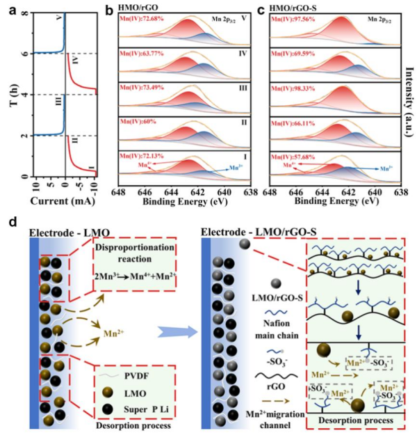 除离子传输效率外,针对锰基电活性材料因电极极化导致的稳定性较差的问题,采用还原氧化石墨烯(rGO)与Nafion协同改性的策略制备得到高效稳定电化学吸附材料。rGO在增加材料分散性的同时大幅降低了材料极化,缓解极化过程带来的容量衰减,使得吸附容量和循环稳定性得到提升。研究表明Nafion通过主链与还原氧化石墨烯表面羧基结合,而支链磺酸基团(-SO3-)可以捕获因歧化反应溶出的Mn2+,从而使得材料表面局部Mn2+浓度升高(图2)。经过协同改性,材料30次循环容量保持率由79.04%提升至94.64%。该研究验证了离子捕获机制抑制歧化反应的可行性,能够为锰系材料在电化学分离过程中的溶损问题提供新的解决思路(Chem. Eng. J,497 (2024) 155009)。