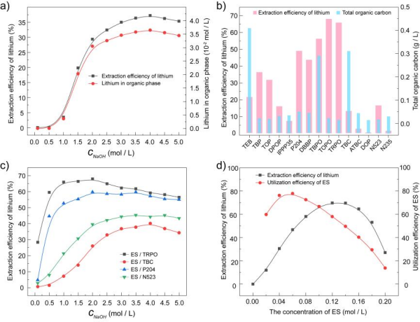 该研究为从碱性溶液中分离锂提供了一种有效的方法,通过对ES和TRPO萃取体系的研究,不仅实现了高Na/Li比例溶液中锂的高效回收,而且在理论上阐明了萃取过程的分子机制,为后续萃取剂构效关系和萃取剂的设计研究提供了理论基础。