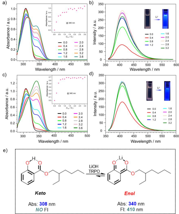 青海盐湖所研究团队对2-乙基己基水杨酸(ES)和三烷基磷酸氧化物(TRPO)混合萃取体系进行了平衡、过程和机理研究。系统研究了影响锂萃取的因素,如有机相组成、水相条件、萃取时间和ES萃取系统的酸碱耐受性。通过平衡研究,设计了从碳酸锂母液中回收锂的整个过程,包括萃取、洗涤、剥离和再生,并成功回收了99%的锂,得到了含25.85 g/L锂和0.08 g/L钠的锂富集溶液。研究表明,萃取过程是热力学自发的熵增过程,在分子水平上,通过紫外-可见光谱(UV–Vis)、荧光光谱(Fl)、核磁共振(1H NMR)和傅里叶变换红外光谱(FT-IR)阐明了配位机制。