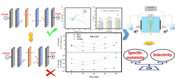 针对传统盐湖卤水制备LiOH技术工艺流程长,制备能耗高,锂资源利用率和产品纯度较低等问题,引入双极膜电渗析(BMED)工艺,在机理层面阐明了卤水体系中各离子传质特点,膜堆构型及双极膜性能对BMED电流效率和LiOH转化率的影响机制,揭示了膜材料的电阻率和同离子选择性之间存在相互“制约”性,唯有在“平衡”二者的基础上方能兼顾高电流效率与高纯度LiOH产品。该工作为基于BMED过程的盐湖卤水直接制备氢氧化锂新工艺开发提供了理论基础,将推动盐湖卤水制备电池级氢氧化锂工艺的实际应用。(Sep. Purif. Technol., 349 (2024) 127875)