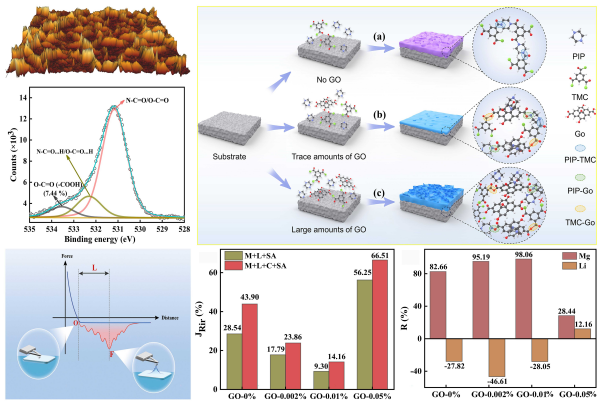 同时针对长期服役于盐湖卤水镁锂分离的纳滤(NF)膜材料进行解析,揭示了膜表面羧基含量、膜微观结构与膜污染的关联机制,通过氧化石墨烯(GO)改性NF膜的功能层,以增强膜的抗污染能力与盐湖卤水中锂的提取效率。研究表明,GO-0.002%和GO-0.01%纳滤膜表现出较低的初始污染率和更高的清洗恢复通量,且对盐湖卤水Mg²⁺的截留率为95%,Li⁺的截留率低于-28%。机理研究表明GO能有效调节PIP在界面聚合过程中的扩散速率,实现NF膜表面的条纹结构、斑点结构和图灵结构之间的转变。该工作还融合AFM探针羧基改性和吸附动力学曲线,实现Ca2+与有机物配位-络合作用的动态监测。研究成果为适用于卤水体系的高性能膜材料的开发提供科学依据。(Chem. Eng. J., 499 (2024) 156269)