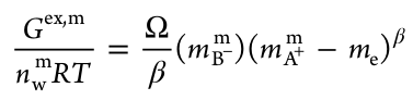 研究人员受Pierre-Gilles de Gennes聚合物标度理论[5]进一步启发,提出“标度正规溶液理论”(即,膜相中“有效自由反离子浓度”与“表观自由反离子浓度”间的幂律关系),用以描述溶胀离子交换膜内自由离子相互作用的超额吉布斯(Gex,m)自由能(式3):