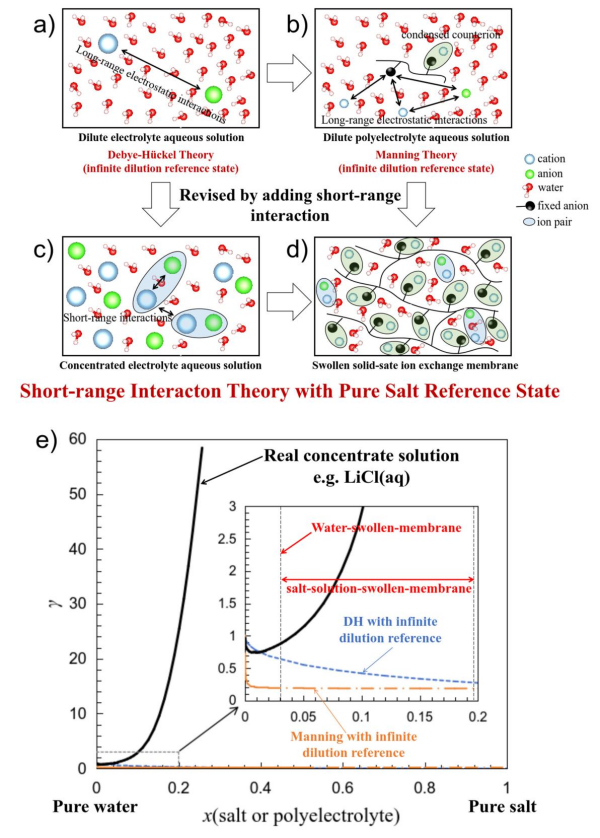 受Kenneth S. Pitzer浓电解质溶液理论启发,研究人员认为:离子交换膜的反离子凝聚效应相较曼宁理论所描述的稀聚电解质溶液要强的多;在纯水溶胀的离子交换膜中,绝大多数的反离子处于凝聚状态,有效的屏蔽了聚合物链上的电荷。因此,自由离子之间的短程作用,而非长程静电作用,才是决定性的。这点与忽略长程静电作用的浓电解质溶液理论完全一致。据此,研究人员创新性提出了"纯水溶胀膜参考态"——首次明确区分了膜内反离子与溶液相中反离子的标准化学势。