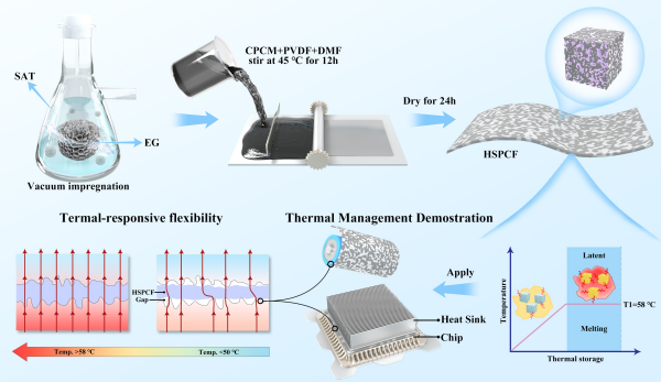 青海盐湖所溶液结构与界面课题组研究团队以三水醋酸钠(SAT)作为相变材料,多孔膨胀石墨构建封装空间,设计了一种无机相变薄膜。通过膨胀石墨在不同方向层间交联形成3D多孔支撑骨架构建“热桥”,实现热量多维度传递。并且当电子器件临界热失控,相变薄膜主动储存热量,该“热传导+热吸收”的双重热管理机制有效缓冲电子器件瞬时热通量,且PVDF的引入使相变薄膜获得热诱导柔性、良好的阻燃与电绝缘性能。研究结果使热失控电池模块温度降低10 ℃,CPU表面温度降低20 ℃。