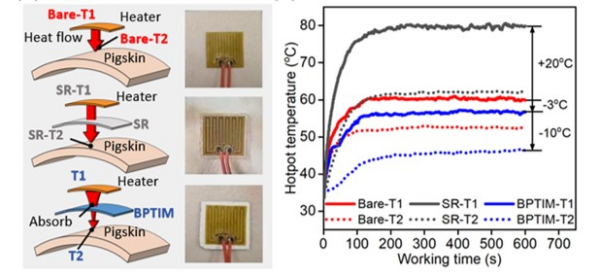 基于双连续相变热界面材料模拟可穿戴电子器件皮肤热管理示意图及不同状态下发热电子元件引起皮肤(模拟)表面温度变化情况比较