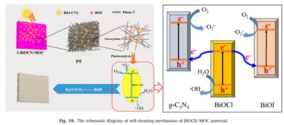 近日,中国科学院青海盐湖研究所镁质胶凝材料科研团队成功研发出一种新型光催化水泥基复合材料,通过高温煅烧与微波辅助溶剂热法合成 g-C₃N₄/BiOCl₀.₅I₀.₅复合光催化剂(BiO-CN2),并创新性地将其与氯氧镁水泥(MOC)复合,成功制备出高性能BiOCN/MOC光催化复合材料。该技术有效解决传统光催化剂可见光响应弱、电荷载流子复合快的痛点,同时显著提升基体性能:4%催化剂掺量下,复合材料28天抗压强度较纯MOC提升20.99%,对RhB染料展现出高效吸附-化学协同降解能力,自清洁性能与结构稳定性同步优化。此研究为光催化水泥基材料的性能突破提供了创新技术路径,为建筑领域绿色环保功能材料的规模化应用奠定了关键基础。