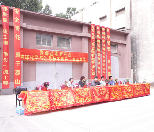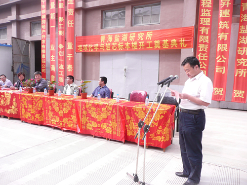 青海省瑞昇建筑有限公司董事长甘富珍和青海金鑫工程监理有限责任公司总经理张振宁先后讲话,表示将认真精心组织施工和监理,保证向青海盐湖研究所建设满意工程。随后,三个单位领导为地球化学与岩芯标本实验楼工程掀土奠基。
