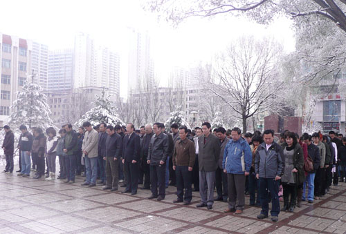 上午10时,随着防空警报鸣响,伴着汽车、火车的鸣笛声,悬挂的国旗降半旗,我所组织全所职工和学生举行默哀仪式,深切哀悼在青海玉树地震中不幸遇难的同胞们。默哀仪式气氛严肃庄重。