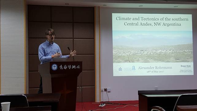Alexander做了题为“Climate and Tectonics of the southern Central Andes, NW Argentina(中南安第斯山(阿根廷西北部)气候和构造演化)” 的报告。讲解了其所在研究团队利用单体碳同位素和氢同位素在南美安第斯山中南部演化中取得的研究成果。他们的研究结果发现安第斯山东边的地形屏障使得其东侧气候湿润,水汽向南输送到达原本干旱的安第斯山中南部。南美低空急流(