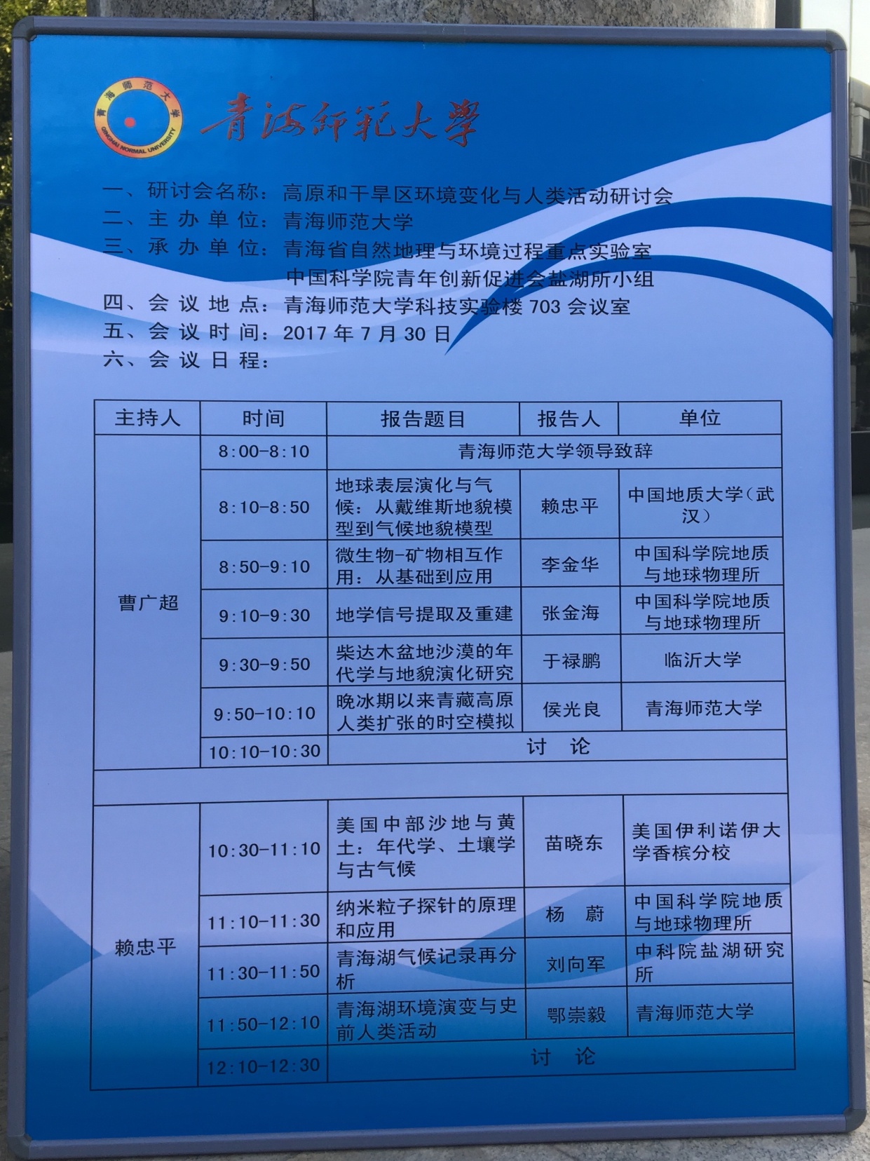 7月30日,由青海师范大学青海省自然地理与环境过程重点实验室承办,青海盐湖所青促会小组协办的高原和干旱区环境变化与人类活动研讨会在青海师范大学顺利举办。
