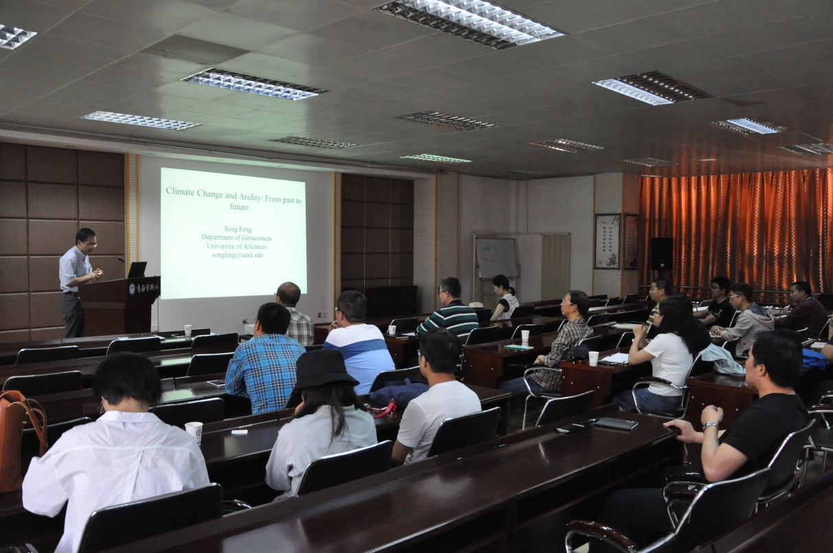 冯松做了题为“Climate change and Aridity: from past to future”的学术报告。冯松先讲述了干旱和干燥度的定义,之后他从未来干旱地区气候变化预测、干旱度变化的原因和过去干旱区干燥度模拟三个方面介绍了其研究团队近些年开展的研究工作及取得的成果。他们认为:(1)全球的干旱区在扩张。到本世纪末,全球干旱区的范围将增加~11%(在RCP 8.5情形下);(2)近期的干旱区扩张现象在过去1000年都未出现过;(3)温度升高主导着预测的未来干燥度变化,其是由热带扩张和哈得来(Hadley Circulation)环流控制。