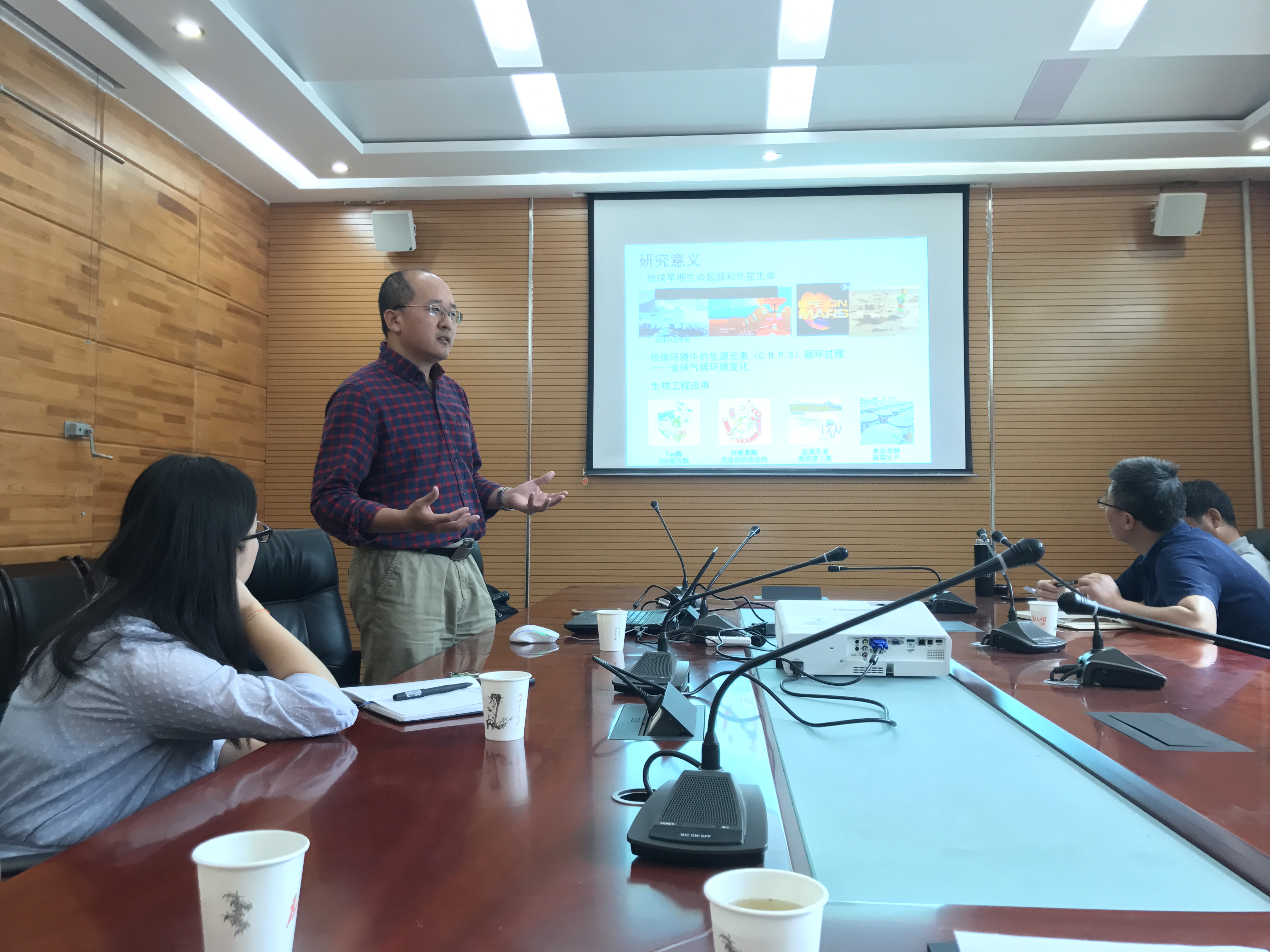 蒋教授的学术报告题目为《青藏高原湖泊碳循环微生物作用》,以青海湖为例作了详细精彩报告。报告涉及到碳源类型对湖泊CO2释放的影响及其与盐度的关系、不同碳源加入对CO2释放速率的影响等内容。蒋老师团队研究表明,不同盐度的湖泊中CO2产生的速率明显不同,这对环境中碳循环具有重要的意义。报告结束后,蒋老师与地学科研人员进行了热烈讨论和学术交流,同时也表达了与地学实验室进行长期深入合作的意愿。