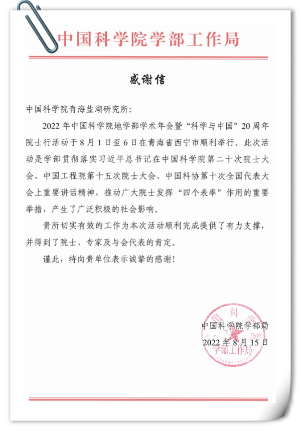 8月22日,青海盐湖所收到中国科学院学部工作局发来的一封感谢信,感谢青海盐湖所作为协办单位,在2022年中国科学院地学部学术年会暨“科学与中国”20周年院士行活动中,为活动的顺利完成提供了有力支撑,并得到了院士、专家及与会代表的肯定,特致感谢信表示感谢。