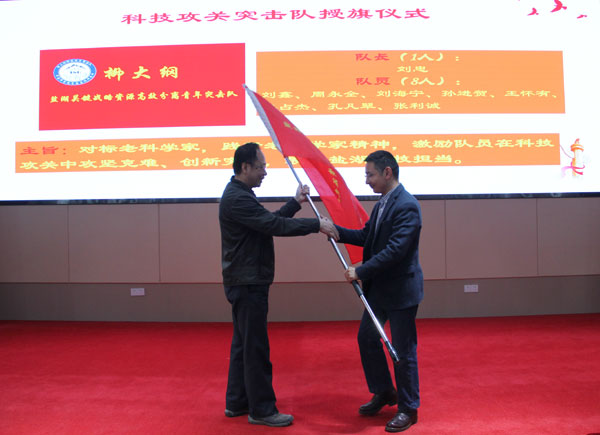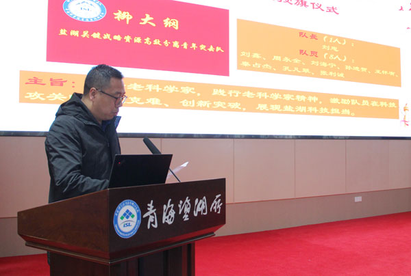 副所长冯海涛宣读了《中共中国科学院青海盐湖所委员会关于组建柳大纲盐湖关键战略资源高效分离青年突击队的通知》,吴志坚为突击队队长授队旗。