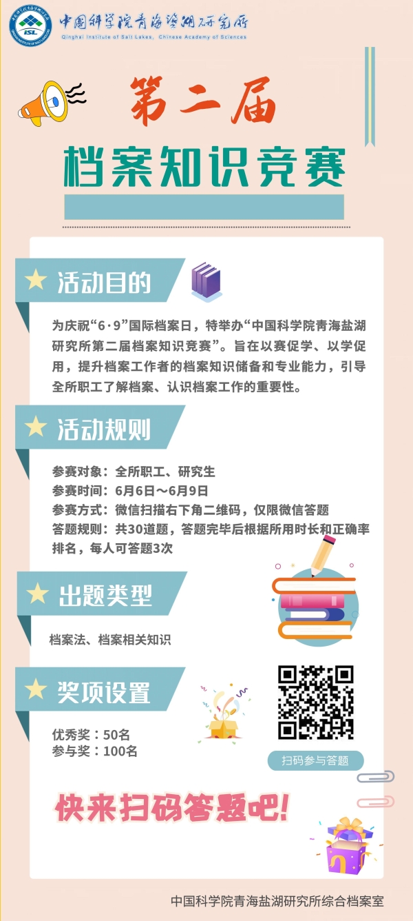 宣传内容包括《档案中的盐湖考察足迹——张彭熹院士》视频展播,以张彭熹院士察尔汗盐湖打钻为主线,通过档案讲述了张彭熹院士扎根西部、刻苦钻研,为盐湖事业奉献一生的故事。同时组织开展《档案知识竞赛》,以赛促学、以学促干,提升全所职工对档案法以及档案相关知识的了解。此次活动共有200余科研、支撑及管理人员参与活动。