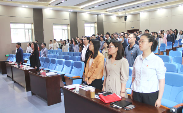 会议举行了新党员宣誓仪式。面向鲜红的党旗,副所长王建萍带领新党员庄严宣誓,在场全体党员重温入党誓词。