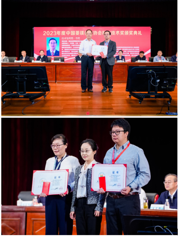 王定邦、吴志坚共同为青海柴循盐湖产业研究有限公司揭牌,吴志坚、李颖虹分别为2023年度中国菱镁协会科学技术奖技术发明奖一等奖和青年科技奖获得者颁发证书。