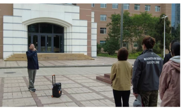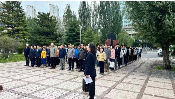 伴着中国人民解放军进行曲音乐响起,担任本次升国旗仪式升旗手的4名研究生迈着铿锵有力的步伐护卫国旗走上升旗台。在雄壮激昂的国歌声中,鲜艳的五星红旗冉冉升起,全体职工和研究生满怀深情向国旗行注目礼,表达对党和祖国的崇高敬意和无限热爱。
