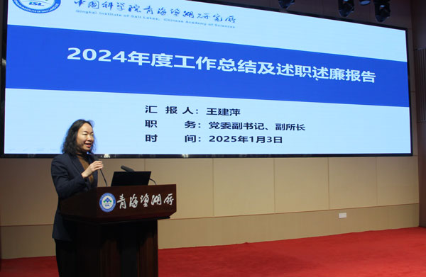 党委副书记、副所长王建萍就青海盐湖所2024年党建工作情况作了报告,汇报了所党委深入学习贯彻党的二十届三中全会精神,学习贯彻习近平总书记关于抢占科技制高点的指示批示精神以及贯彻落实院党组工作部署等情况,同时报告了开展党纪学习教育、持之以恒抓作风学风建设、三项纪律落实情况等重点工作和巩固基层党组织战斗堡垒、新引进人才交流座谈会等亮点工作。同时,王建萍还就个人其他分管工作完成情况以及本人负责的课题组工作完成情况进行了汇报。