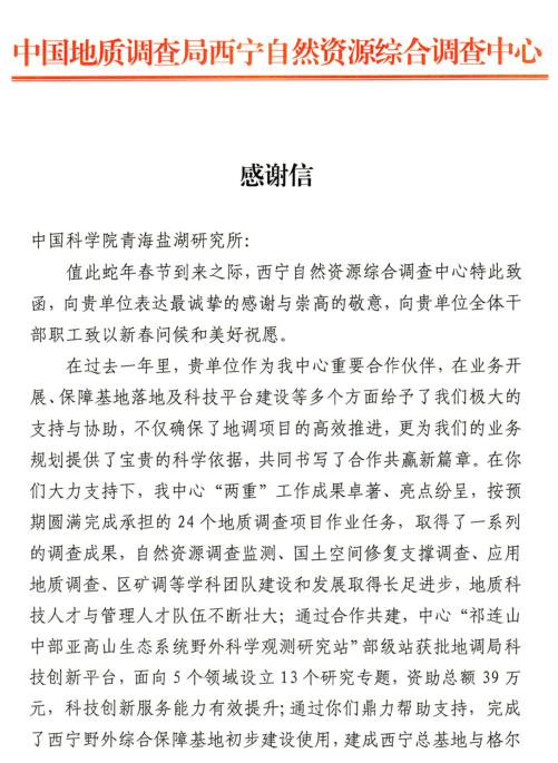 一封来自中国地质调查局西宁自然资源综合调查中心的感谢信