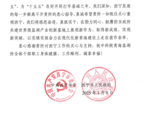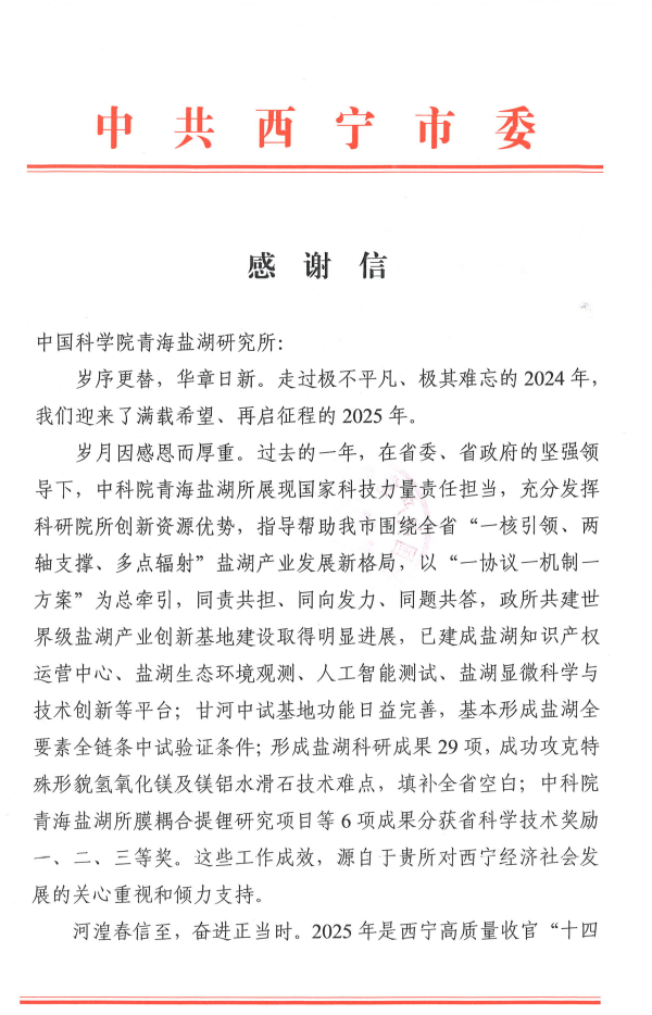 西宁市委、市政府致青海盐湖所的一封感谢信