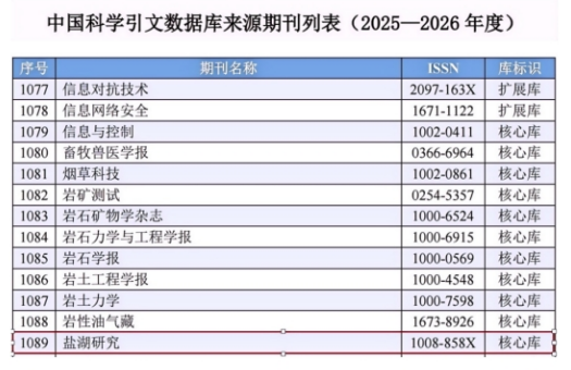 8月7日,中国科学院文献情报中心公布了中国科学引文数据库(CSCD)2025 —2026 年来源期刊遴选结果,由中国科学院青海盐湖研究所主办的《盐湖研究》成功入选 CSCD 来源期刊核心库。这一成绩标志着《盐湖研究》在学术质量、影响力和期刊规范化建设等方面获得了国内权威机构的高度认可,实现了期刊发展的重大突破。