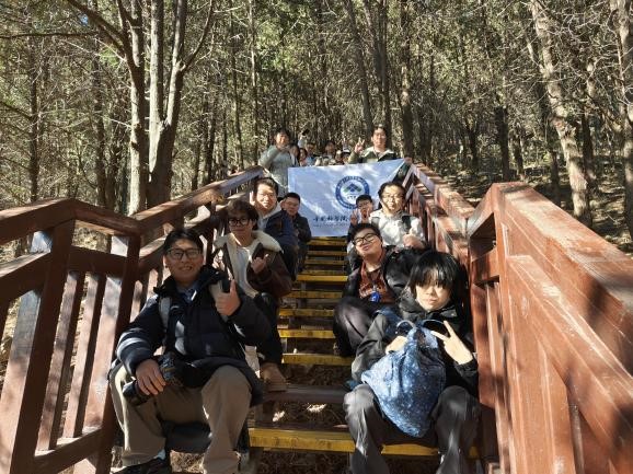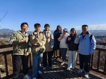 队伍沿雁栖湖校区出发,穿林越阶,在陡坡与栈道交错间竞速前行。观景台极目远眺,京北山色尽收眼底。一路上,陡坡栈道考验耐力,峰顶远眺开阔胸怀,梵音钟鼓沉淀初心。大家相互搀扶、彼此等待,用脚步丈量自然,用笑声缩短跨学科的距离。高强度的徒步为新“盐湖人”注入了坚毅、协作、沉静的集体底色。在这片自然与人文交融的天地间,大家纷纷畅谈科研志向,分享求学初心。“登高”不仅是为了望远,更是为了“明志”——在高处审视自我,在广阔中确立方向。有同学感慨:“科研之路正如登山,不在于一蹴而就,而在于持之以恒的积累与攀登。”