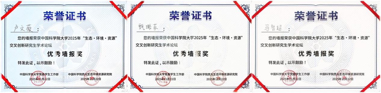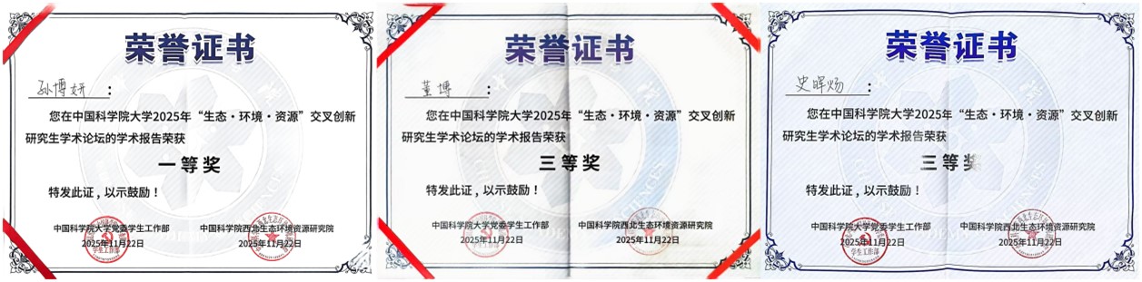 论坛设置“生态与环境领域组”“资源与工程领域组”及“弘扬科学家精神与研究生思政教育管理研讨组”三大专题板块,聚焦国家战略需求与科技前沿,推动学科融合与协同创新。青海盐湖所研究生紧扣青藏高原生态安全屏障、柴达木盆地资源高效利用与环境保护等关键科学问题等多个方向进行学术报告和墙报展示。现场讨论热烈,学术氛围浓厚。通过这一高水平平台,青海盐湖所研究生不仅展示了最新的科研进展,更与兄弟院所建立了深入的学术联系,为后续合作奠定了良好基础。参会研究生们凭借出色表现,成绩斐然。孙博妍荣获优秀学术报告一等奖;董博与史晖炀荣获优秀学术报告三等奖;马智超、甄璐菲、卢文薇的墙报荣获优秀墙报奖。
